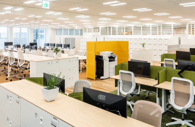 当社では個⼈指定のデスクはなく、仕事の進捗状況やその⽇の気分に合わせて、座る場所を自由に決めています。毎日異なる社員が隣になることで、自然とコミュニケーションが生まれ、部署を越えた情報交換や連携が活性化されています。